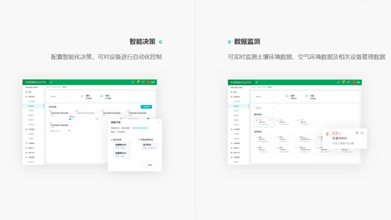 2020年公司專注于智慧農(nóng)業(yè)關(guān)鍵技術(shù)研發(fā),積極探索重慶智慧農(nóng)業(yè)發(fā)展新方向。先后服務(wù)酉陽、石柱、南川、北碚等區(qū)域客戶智慧農(nóng)業(yè)云平臺建設(shè),受到業(yè)主一致好評。公司始終堅持“產(chǎn)品+數(shù)據(jù)+技術(shù)+服務(wù)”的發(fā)展模式,致力于智慧農(nóng)業(yè)整體解決方案研發(fā)和服務(wù)。通過數(shù)據(jù)和技術(shù)雙輪驅(qū)動,實現(xiàn)農(nóng)業(yè)規(guī)模化、精準化、智能化。